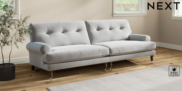 7.2.10 Erin Buttoned Back Deep Relaxed Sit 4 Seater Large Sofa Tweedy Blend Easy Clean Light Silver Grey High Classic Turned Chrome Castor - Mid | Made Click here to use our website with more accessibility support, for example screen readers
