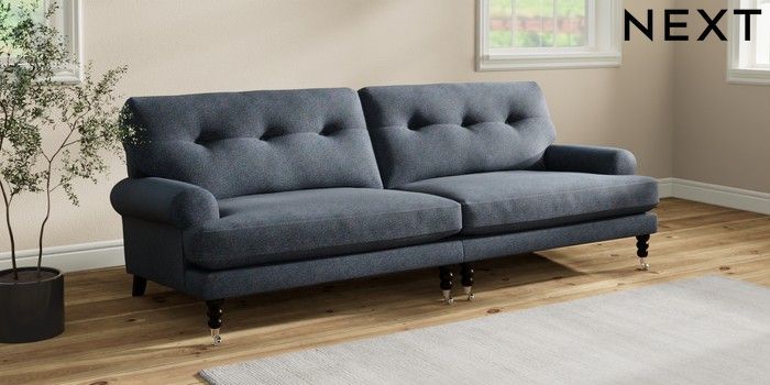 7.2.10 Erin Buttoned Back Deep Relaxed Sit 4 Seater Large Sofa Tweedy Chenille Navy Blue High Classic Turned Chrome Castor - Dark | Made Click here to use our website with more accessibility support, for example screen readers