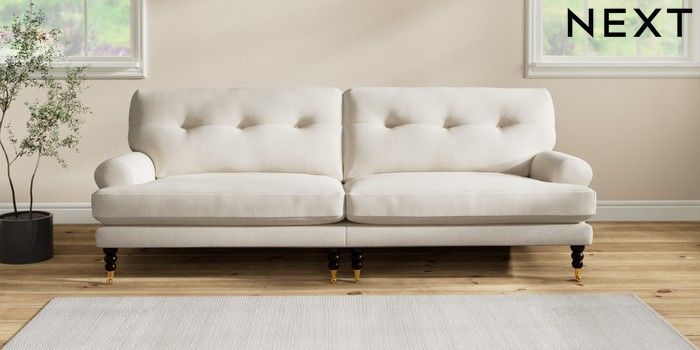 7.2.10 Erin Buttoned Back Deep Relaxed Sit 4 Seater Large Sofa Tweedy Chenille Oyster High Classic Turned Brass Castor - Dark | Made Click here to use our website with more accessibility support, for example screen readers