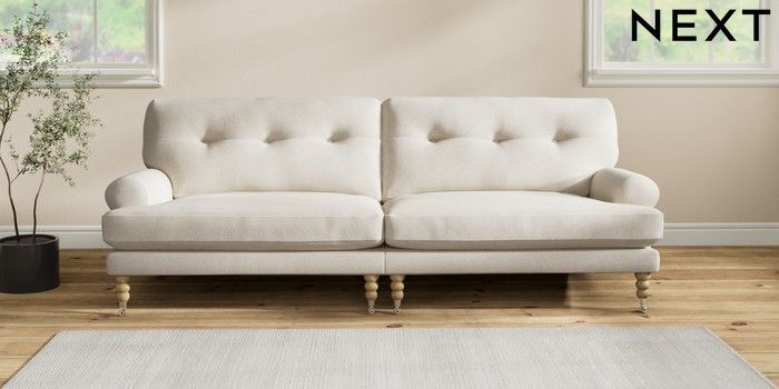 7.2.10 Erin Buttoned Back Deep Relaxed Sit 4 Seater Large Sofa Tweedy Chenille Oyster High Classic Turned Chrome Castor - Light | Made Click here to use our website with more accessibility support, for example screen readers