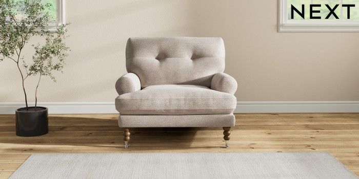 7.2.10 Erin Buttoned Back Deep Relaxed Sit Armchair Boucle Chenille Light Natural High Classic Turned Chrome Castor - Mid | Made Click here to use our website with more accessibility support, for example screen readers