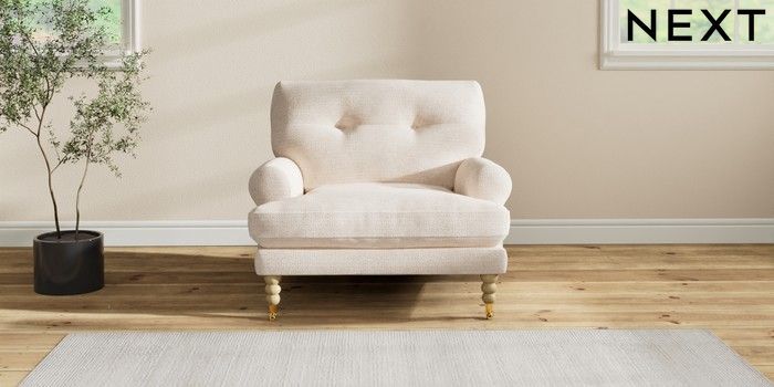 7.2.10 Erin Buttoned Back Deep Relaxed Sit Armchair Boucle Chenille Oyster High Classic Turned Brass Castor - Light | Made Click here to use our website with more accessibility support, for example screen readers