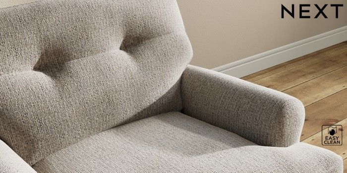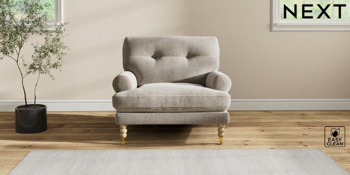7.2.10 Erin Buttoned Back Deep Relaxed Sit Armchair Chunky Boucle Easy Clean Dove High Classic Turned Brass Castor - Light | Made Click here to use our website with more accessibility support, for example screen readers