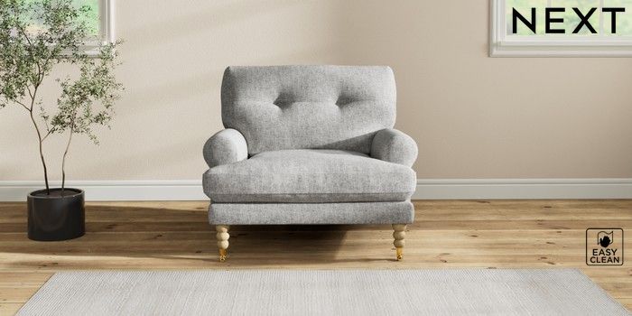 7.2.10 Erin Buttoned Back Deep Relaxed Sit Armchair Chunky Boucle Easy Clean Light Grey High Classic Turned Brass Castor - Light | Made Click here to use our website with more accessibility support, for example screen readers
