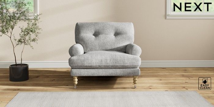 7.2.10 Erin Buttoned Back Deep Relaxed Sit Armchair Chunky Boucle Easy Clean Light Grey High Classic Turned Chrome Castor - Light | Made Click here to use our website with more accessibility support, for example screen readers