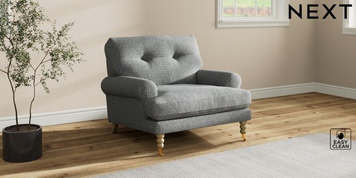 7.2.10 Erin Buttoned Back Deep Relaxed Sit Armchair Chunky Boucle Easy Clean Mid Grey High Classic Turned Brass Castor - Light | Made Click here to use our website with more accessibility support, for example screen readers