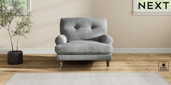 7.2.10 Erin Buttoned Back Deep Relaxed Sit Armchair Chunky Boucle Easy Clean Mid Grey High Classic Turned Chrome Castor - Mid | Made Click here to use our website with more accessibility support, for example screen readers