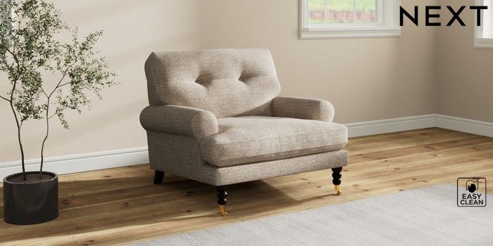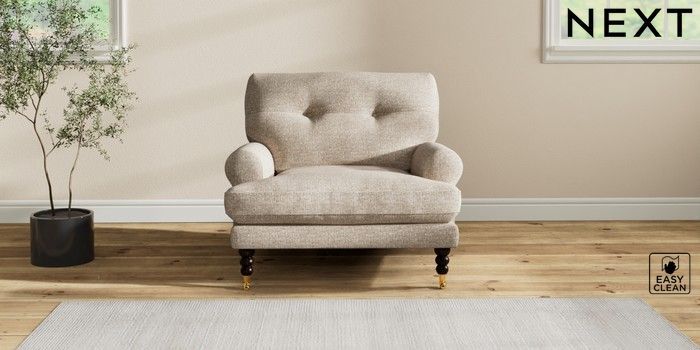 7.2.10 Erin Buttoned Back Deep Relaxed Sit Armchair Chunky Boucle Easy Clean Mid Natural High Classic Turned Brass Castor - Dark | Made Click here to use our website with more accessibility support, for example screen readers