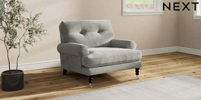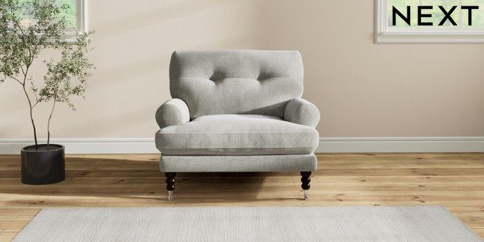7.2.10 Erin Buttoned Back Deep Relaxed Sit Armchair Chunky Chenille Light Grey High Classic Turned Chrome Castor - Dark | Made Click here to use our website with more accessibility support, for example screen readers