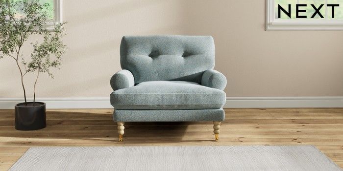 7.2.10 Erin Buttoned Back Deep Relaxed Sit Armchair Chunky Marl Mid Blue High Classic Turned Brass Castor - Light | Made Click here to use our website with more accessibility support, for example screen readers