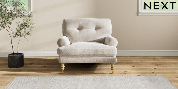 7.2.10 Erin Buttoned Back Deep Relaxed Sit Armchair Chunky Marl Oyster High Classic Turned Brass Castor - Light | Made Click here to use our website with more accessibility support, for example screen readers