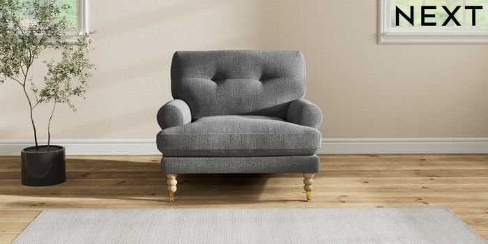 7.2.10 Erin Buttoned Back Deep Relaxed Sit Armchair Chunky Texture Dark Grey High Classic Turned Brass Castor - Light | Made Click here to use our website with more accessibility support, for example screen readers