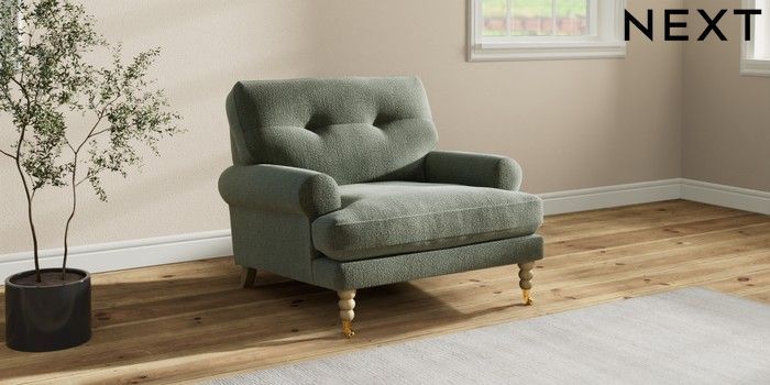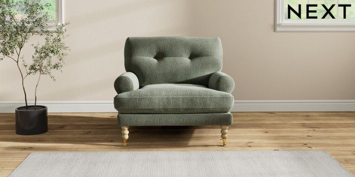 7.2.10 Erin Buttoned Back Deep Relaxed Sit Armchair Chunky Texture Mid Forest Green High Classic Turned Brass Castor - Light | Made Click here to use our website with more accessibility support, for example screen readers