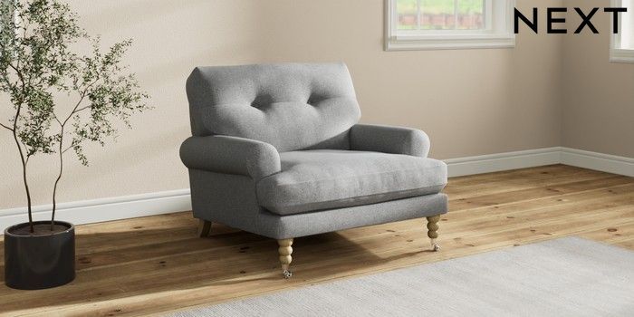 7.2.10 Erin Buttoned Back Deep Relaxed Sit Armchair Chunky Weave Mid Grey High Classic Turned Chrome Castor - Light | Made Click here to use our website with more accessibility support, for example screen readers