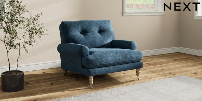 7.2.10 Erin Buttoned Back Deep Relaxed Sit Armchair Cotswold Chenille Dark Blue High Classic Turned Chrome Castor - Light | Made Click here to use our website with more accessibility support, for example screen readers