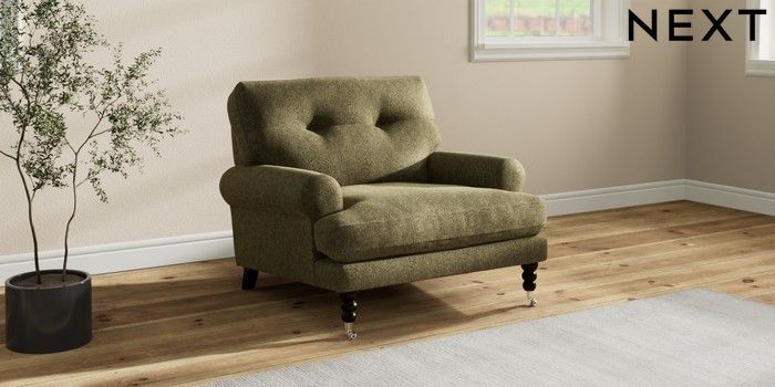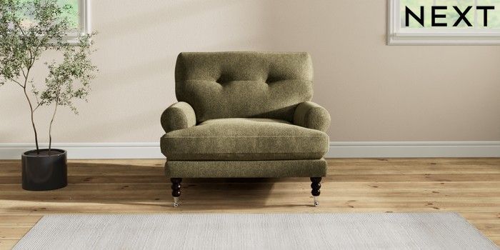 7.2.10 Erin Buttoned Back Deep Relaxed Sit Armchair Cotswold Chenille Dark Green High Classic Turned Chrome Castor - Dark | Made Click here to use our website with more accessibility support, for example screen readers