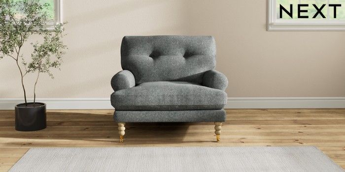 7.2.10 Erin Buttoned Back Deep Relaxed Sit Armchair Cotswold Chenille Dark Grey High Classic Turned Brass Castor - Light | Made Click here to use our website with more accessibility support, for example screen readers