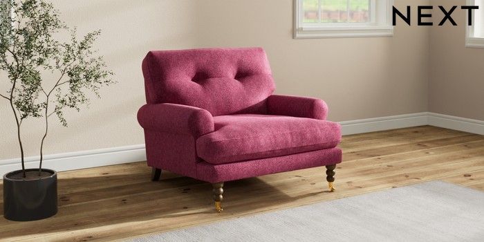 7.2.10 Erin Buttoned Back Deep Relaxed Sit Armchair Cotswold Chenille Dark Raspberry Pink High Classic Turned Brass Castor - Mid | Made Click here to use our website with more accessibility support, for example screen readers