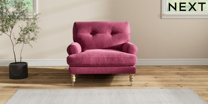 7.2.10 Erin Buttoned Back Deep Relaxed Sit Armchair Cotswold Chenille Dark Raspberry Pink High Classic Turned Chrome Castor - Light | Made Click here to use our website with more accessibility support, for example screen readers