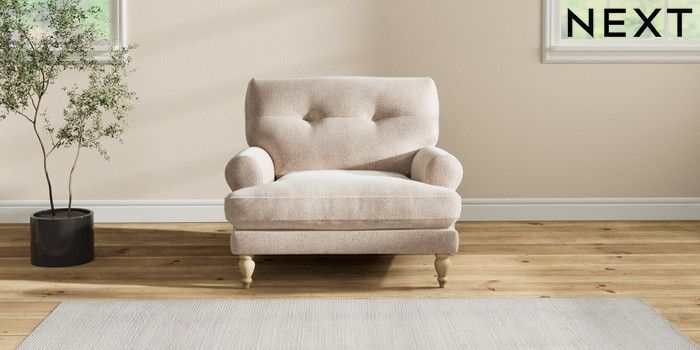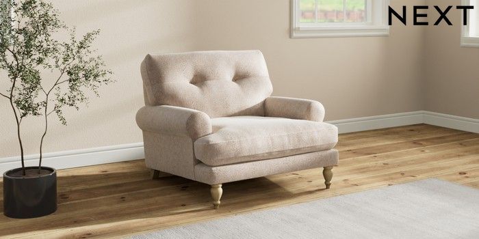 7.2.10 Erin Buttoned Back Deep Relaxed Sit Armchair Cotswold Chenille Light Natural High Classic Turned - Light | Made Click here to use our website with more accessibility support, for example screen readers