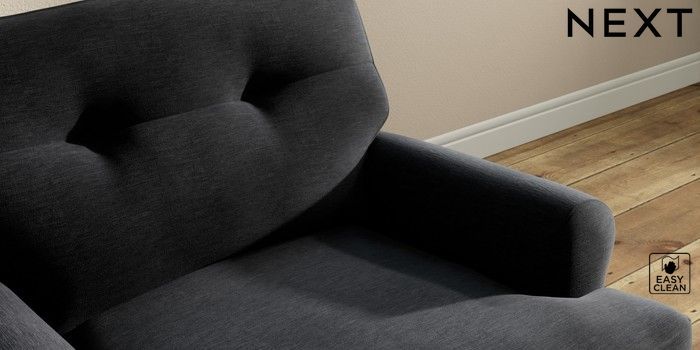 7.2.10 Erin Buttoned Back Deep Relaxed Sit Armchair Fine Chenille Easy Clean Black High Classic Turned Chrome Castor - Mid | Made Click here to use our website with more accessibility support, for example screen readers