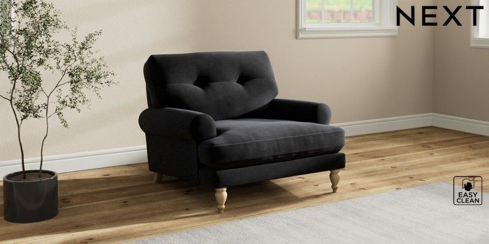 7.2.10 Erin Buttoned Back Deep Relaxed Sit Armchair Fine Chenille Easy Clean Black High Classic Turned - Light | Made Click here to use our website with more accessibility support, for example screen readers