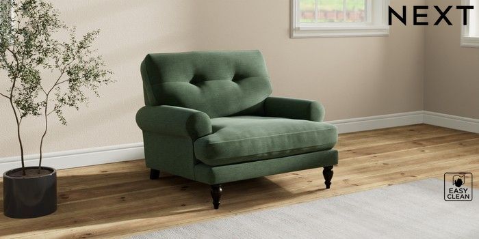 7.2.10 Erin Buttoned Back Deep Relaxed Sit Armchair Fine Chenille Easy Clean Mid Khaki Green High Classic Turned - Dark | Made Click here to use our website with more accessibility support, for example screen readers