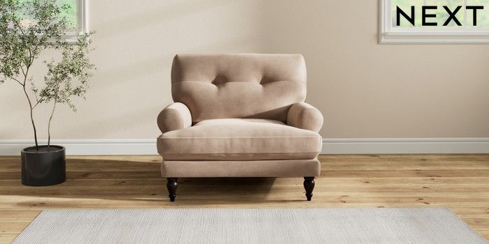 7.2.10 Erin Buttoned Back Deep Relaxed Sit Armchair Luxe Chenille Mid Natural High Classic Turned - Dark | Made Click here to use our website with more accessibility support, for example screen readers