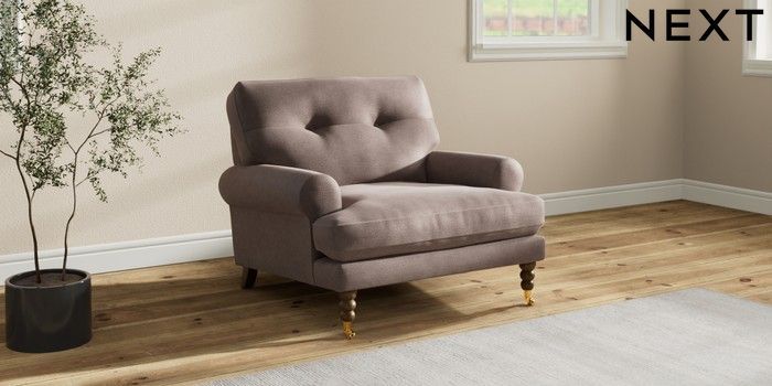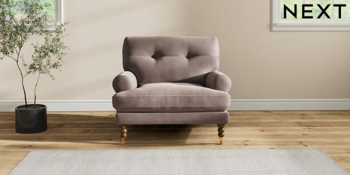 7.2.10 Erin Buttoned Back Deep Relaxed Sit Armchair Luxe Chenille Mink Brown High Classic Turned Brass Castor - Mid | Made Click here to use our website with more accessibility support, for example screen readers
