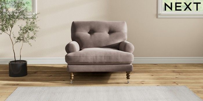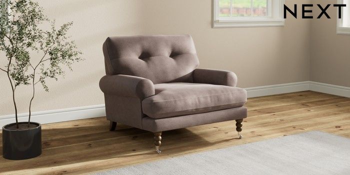 7.2.10 Erin Buttoned Back Deep Relaxed Sit Armchair Luxe Chenille Mink Brown High Classic Turned Chrome Castor - Mid | Made Click here to use our website with more accessibility support, for example screen readers