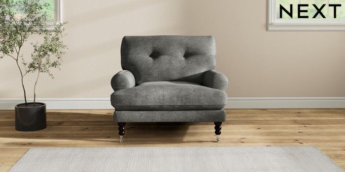 7.2.10 Erin Buttoned Back Deep Relaxed Sit Armchair Plush Chenille Dark Grey High Classic Turned Chrome Castor - Dark | Made Click here to use our website with more accessibility support, for example screen readers