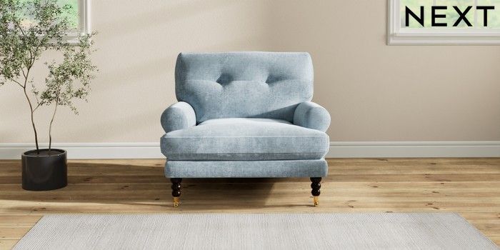 7.2.10 Erin Buttoned Back Deep Relaxed Sit Armchair Plush Chenille Light Blue High Classic Turned Brass Castor - Dark | Made Click here to use our website with more accessibility support, for example screen readers