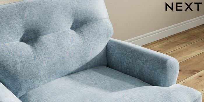 7.2.10 Erin Buttoned Back Deep Relaxed Sit Armchair Plush Chenille Light Blue High Classic Turned Brass Castor - Mid | Made Click here to use our website with more accessibility support, for example screen readers