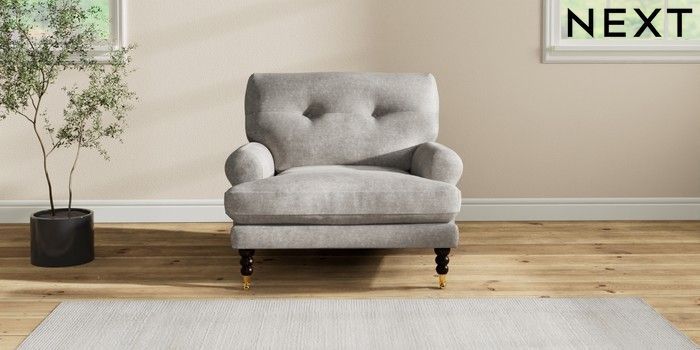 7.2.10 Erin Buttoned Back Deep Relaxed Sit Armchair Plush Chenille Light Grey High Classic Turned Brass Castor - Dark | Made Click here to use our website with more accessibility support, for example screen readers