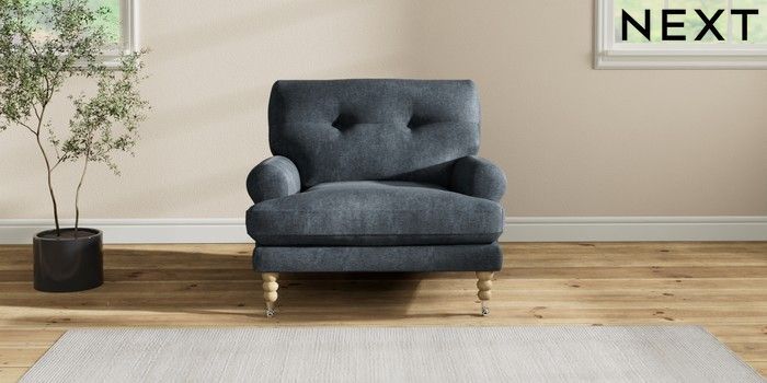 7.2.10 Erin Buttoned Back Deep Relaxed Sit Armchair Plush Chenille Slate Blue High Classic Turned Chrome Castor - Light | Made Click here to use our website with more accessibility support, for example screen readers