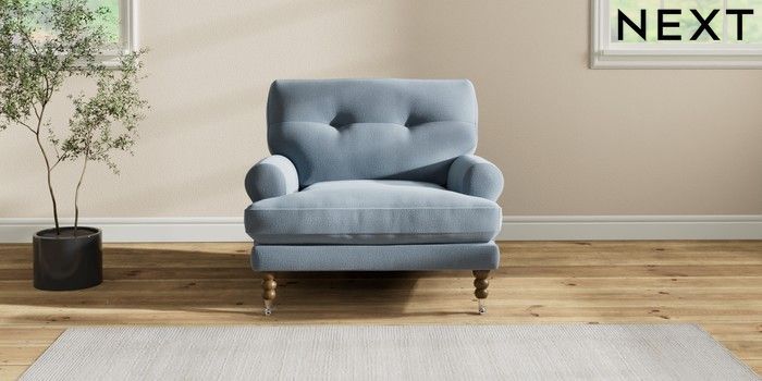 7.2.10 Erin Buttoned Back Deep Relaxed Sit Armchair Relaxed Linen Look Mid Blue High Classic Turned Chrome Castor - Mid | Made Click here to use our website with more accessibility support, for example screen readers