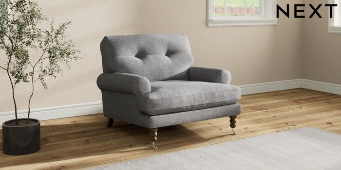 7.2.10 Erin Buttoned Back Deep Relaxed Sit Armchair Studio Chenille Mid Grey High Classic Turned Chrome Castor - Mid | Made Click here to use our website with more accessibility support, for example screen readers