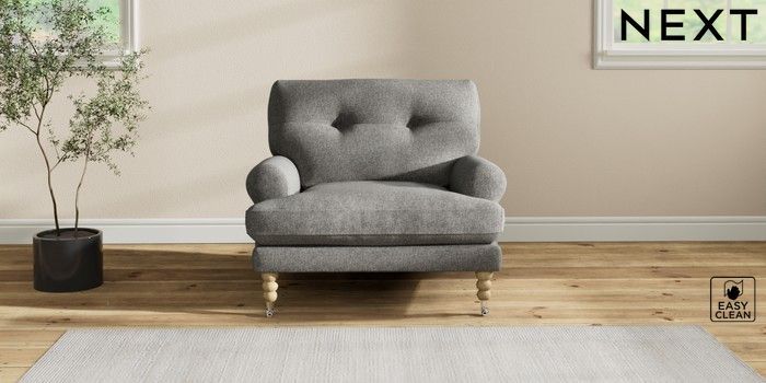 7.2.10 Erin Buttoned Back Deep Relaxed Sit Armchair Tweedy Blend Easy Clean Dark Grey High Classic Turned Chrome Castor - Light | Made Click here to use our website with more accessibility support, for example screen readers