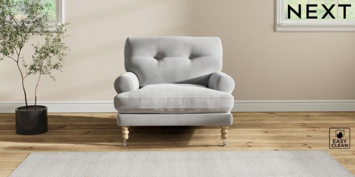 7.2.10 Erin Buttoned Back Deep Relaxed Sit Armchair Tweedy Blend Easy Clean Light Silver Grey High Classic Turned Chrome Castor - Light | Made Click here to use our website with more accessibility support, for example screen readers