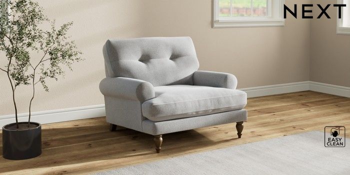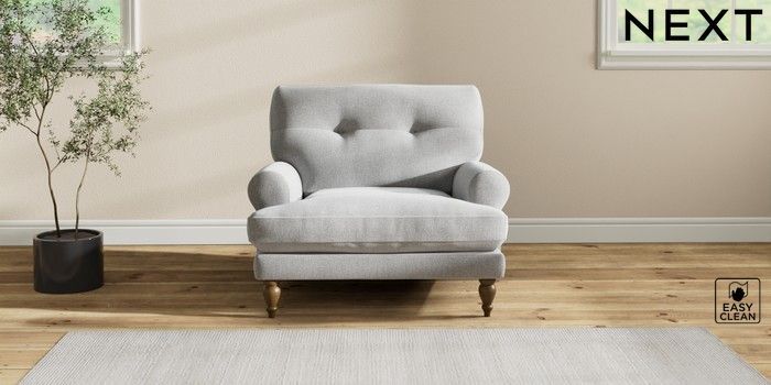 7.2.10 Erin Buttoned Back Deep Relaxed Sit Armchair Tweedy Blend Easy Clean Light Silver Grey High Classic Turned - Mid | Made Click here to use our website with more accessibility support, for example screen readers