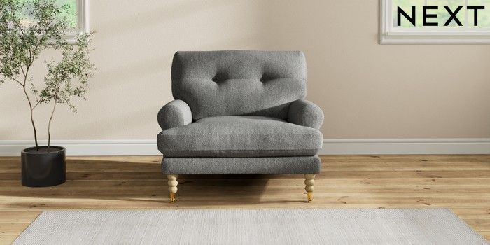7.2.10 Erin Buttoned Back Deep Relaxed Sit Armchair Tweedy Chenille Dark Grey High Classic Turned Brass Castor - Light | Made Click here to use our website with more accessibility support, for example screen readers