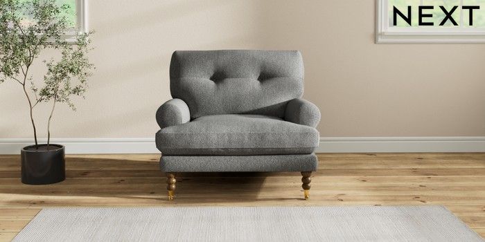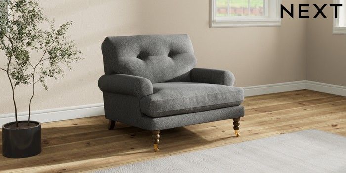 7.2.10 Erin Buttoned Back Deep Relaxed Sit Armchair Tweedy Chenille Dark Grey High Classic Turned Brass Castor - Mid | Made Click here to use our website with more accessibility support, for example screen readers