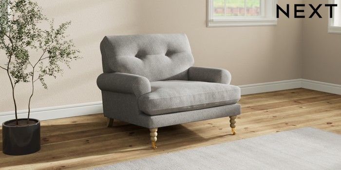 7.2.10 Erin Buttoned Back Deep Relaxed Sit Armchair Tweedy Chenille Mid Grey High Classic Turned Brass Castor - Light | Made Click here to use our website with more accessibility support, for example screen readers