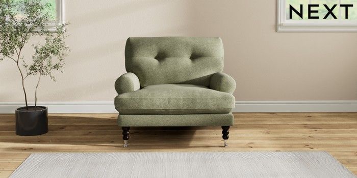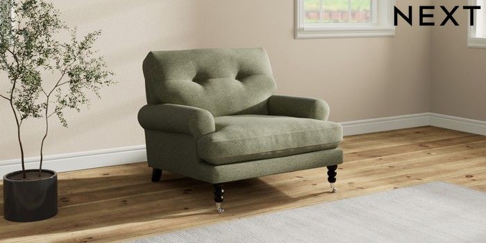 7.2.10 Erin Buttoned Back Deep Relaxed Sit Armchair Tweedy Chenille Mid Moss Green High Classic Turned Chrome Castor - Dark | Made Click here to use our website with more accessibility support, for example screen readers