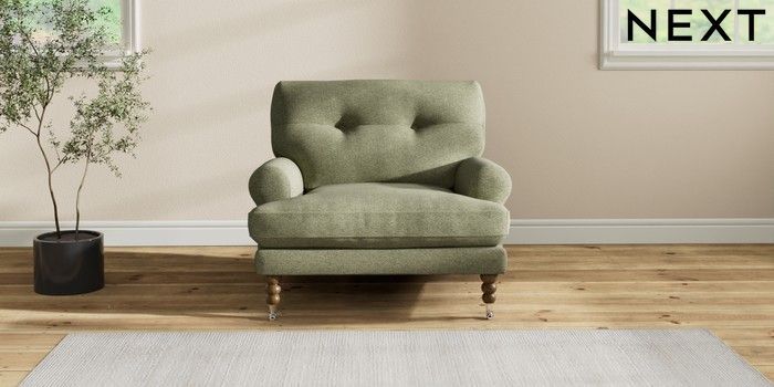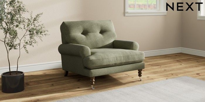 7.2.10 Erin Buttoned Back Deep Relaxed Sit Armchair Tweedy Chenille Mid Moss Green High Classic Turned Chrome Castor - Mid | Made Click here to use our website with more accessibility support, for example screen readers