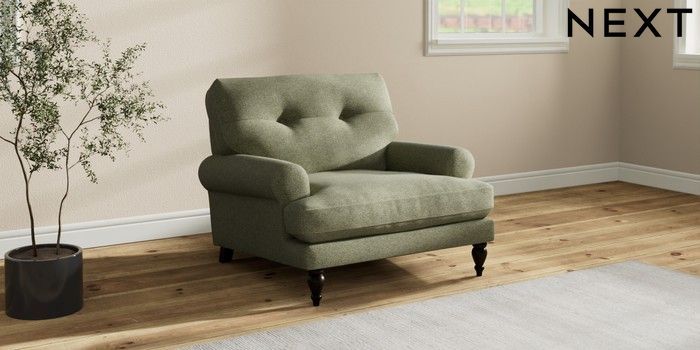7.2.10 Erin Buttoned Back Deep Relaxed Sit Armchair Tweedy Chenille Mid Moss Green High Classic Turned - Dark | Made Click here to use our website with more accessibility support, for example screen readers