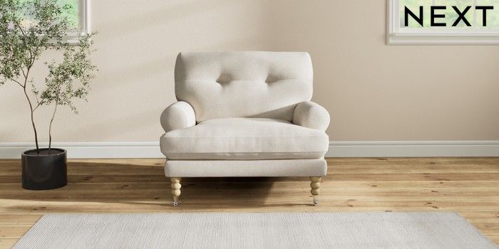 7.2.10 Erin Buttoned Back Deep Relaxed Sit Armchair Tweedy Chenille Oyster High Classic Turned Chrome Castor - Light | Made Click here to use our website with more accessibility support, for example screen readers