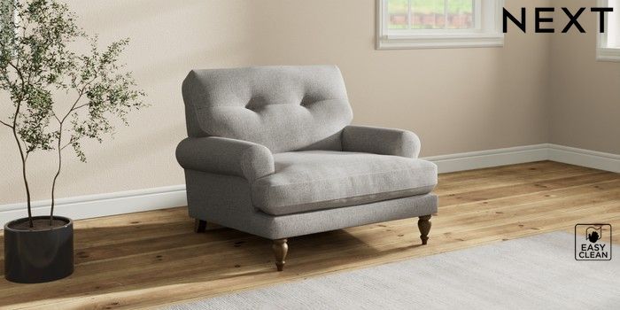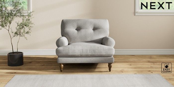 7.2.10 Erin Buttoned Back Deep Relaxed Sit Armchair Woven Chenille Easy Clean Light Grey High Classic Turned - Mid | Made Click here to use our website with more accessibility support, for example screen readers