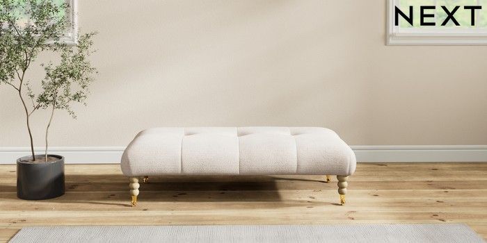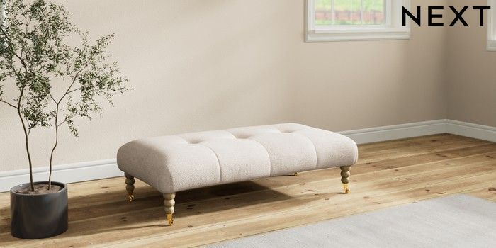 7.2.10 Erin Buttoned Back Deep Relaxed Sit Extra Large Footstool Boucle Chenille Oyster High Classic Turned Brass Castor - Light | Made Click here to use our website with more accessibility support, for example screen readers