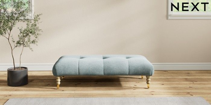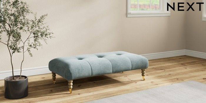 7.2.10 Erin Buttoned Back Deep Relaxed Sit Extra Large Footstool Chunky Chenille Light Teal Green High Classic Turned Brass Castor - Light | Made Click here to use our website with more accessibility support, for example screen readers